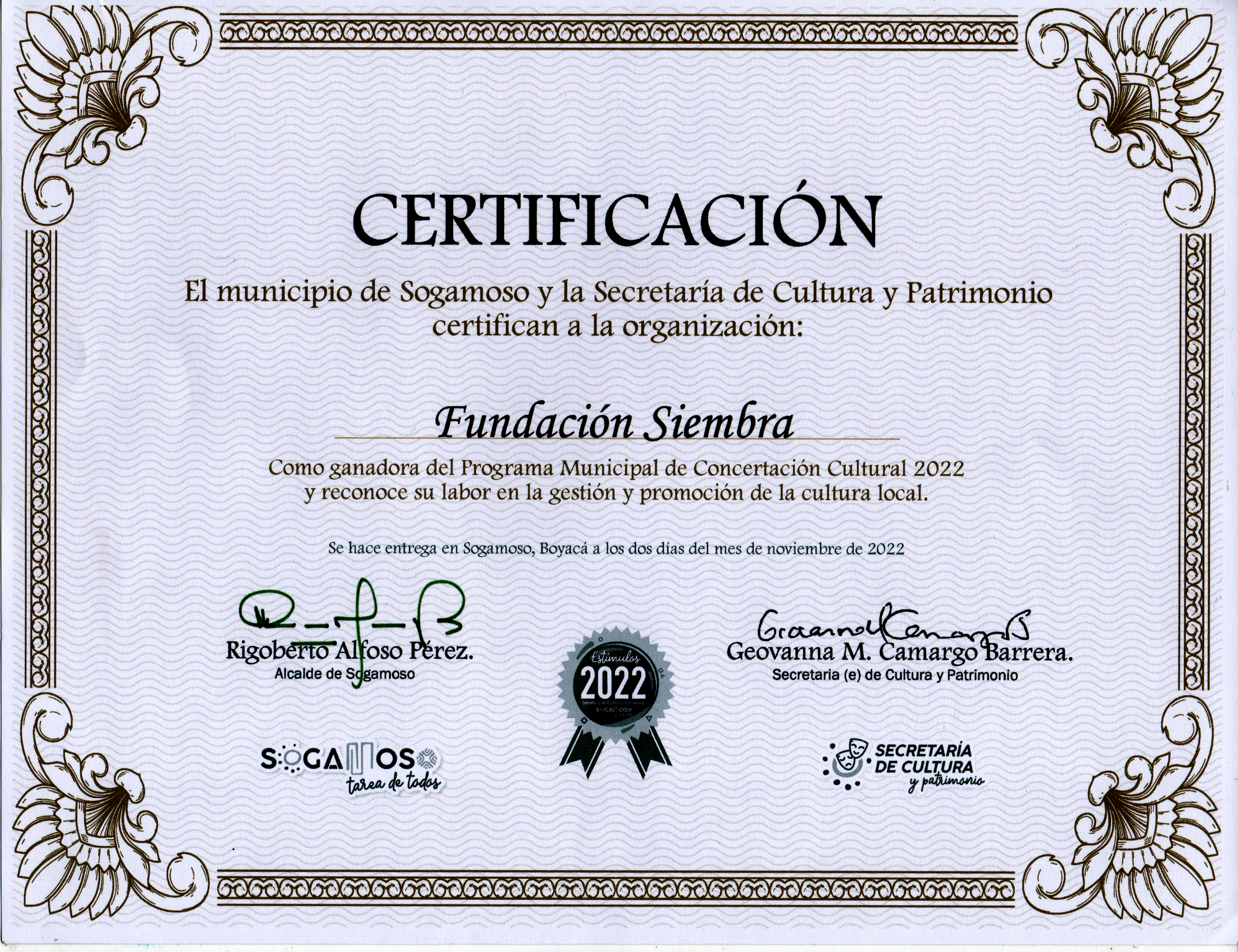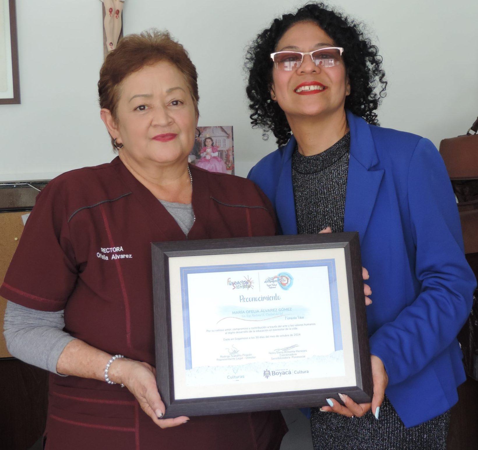 Fundación Siembra otorga Reconocimiento a María Ofelia Álvarez, Rectora Colegio Ciudad del Sol, por su aporte significativo al arte y la cultura sogmoseña. Proyecto Arte-proyecto Revista Cultural Audiovisual. Ministerio de las Culturas, las Artes y los Saberes y Gobernación de Boyacá 2024.